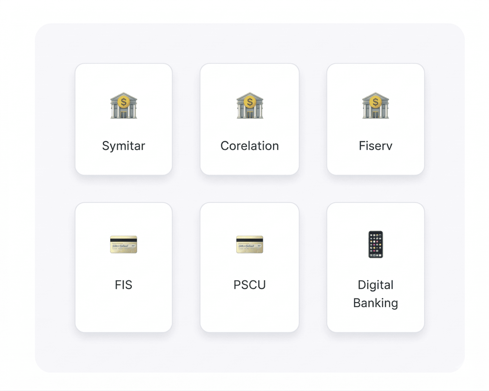 - Card processor integration (Visa, Mastercard, FIS, Fiserv)
